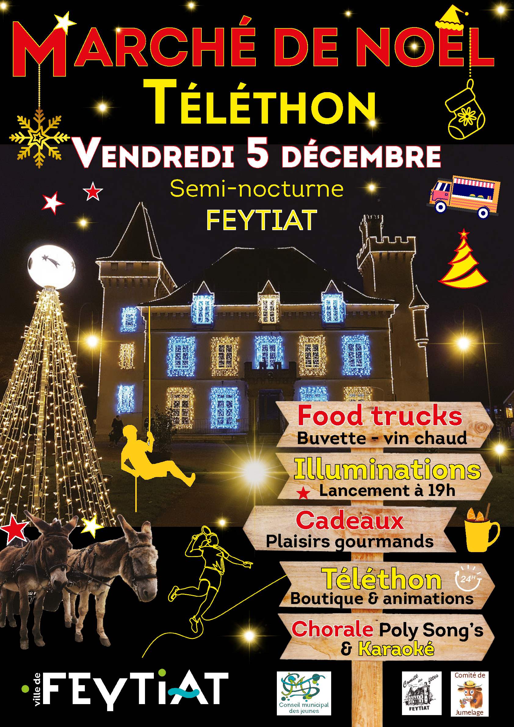 Marché de Noël semi-nocturne dans le parc de la mairie : exposants d’artisanat d’art, plaisirs gourmands, food-trucks, vin chaud, musique, boutique Téléthon, nombreuses animations sportives et culturelles…