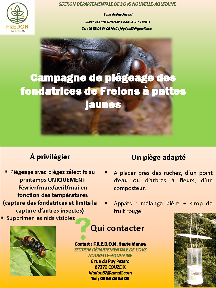 - Frelon à pattes jaunes : contacter directement la FREDON Haute-Vienne.