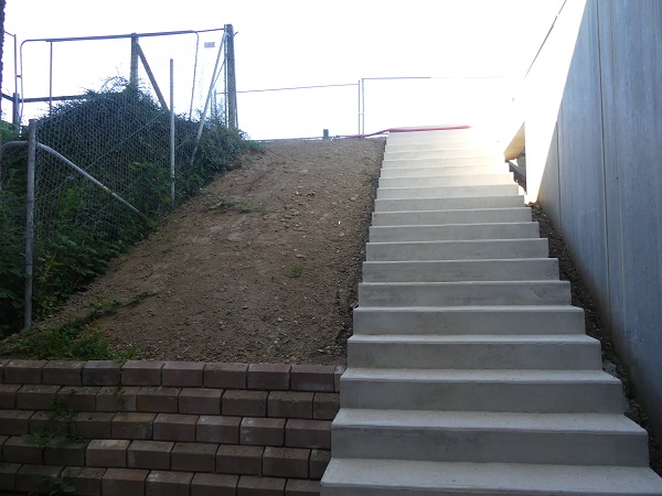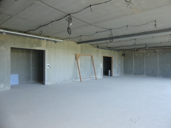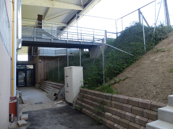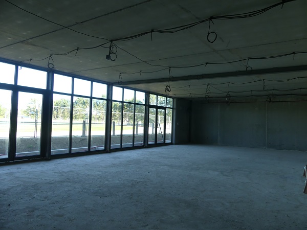 – l’espace vestiaires et équipements dédiés au football, en accès direct depuis le terrain en hauteur. La salle de convivialité se trouve sur ce même plateau, derrière les tribunes du basket.