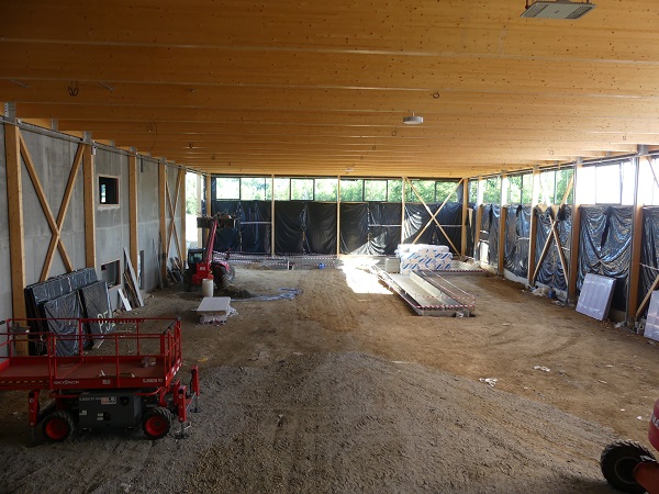 Le chantier a débuté en juin 2019 et malgré l’arrêt d’activité lié à la crise sanitaire, la fin des travaux reste maintenue pour le mois de novembre 2020.  Actuellement la salle de gym est presque hors d’eau. Le cloisonnement des vestiaires et autres espaces se termine. La pose des bardages va pouvoir commencer.