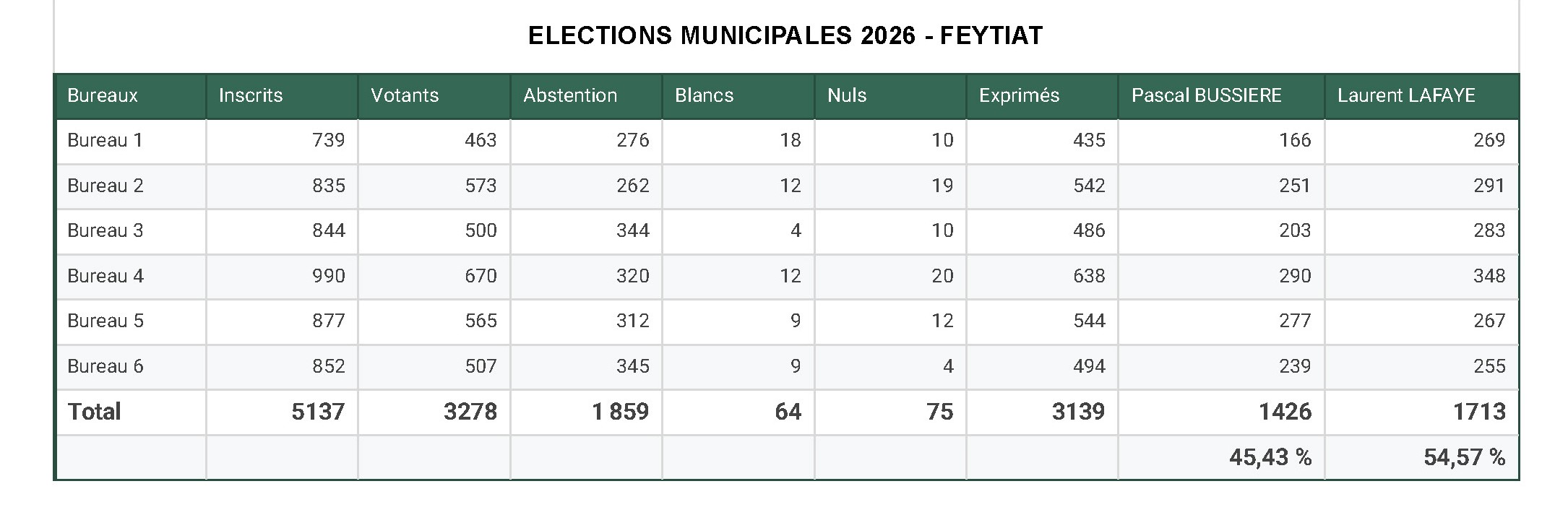 À l’issue du scrutin, la liste conduite par Laurent Lafaye arrive en tête avec 54,57 % des voix.