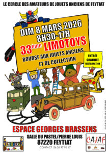 Le CAJAF vous présente la 33é édition de sa bourse aux jouets anciens et de collection Limotoys, le dimanche 8 mars 226 de 8h30 à 17h. ...