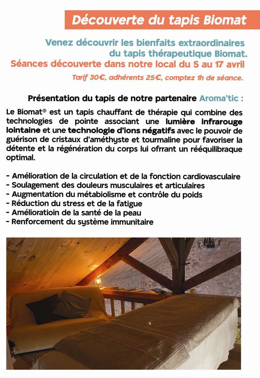 Découverte du tapis Biomat 1 avril 2026Du 5 avril 2026au 17 avril 2026Lieu: Village d'ImbourdeixTarifs: A partir de 25 €Plus d’infosGénéral Share on FacebookShare on TwitterShare on Linkedin