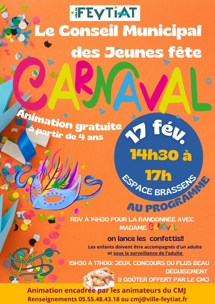 - 15h30 à 17h : Jeux, concours du plus beau déguisement & goûter offert par le CMJ