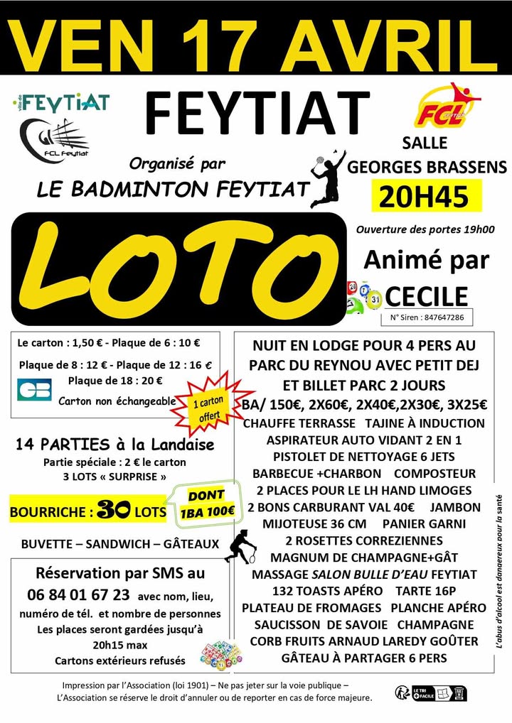 Loto du badminton 24 mars 2026Le 17 avril 2026Heure : 20h45Lieu: Espace culturel Georges-BrassensGénéral Share on FacebookShare on TwitterShare on Linkedin