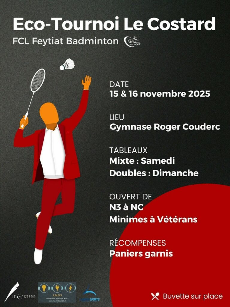 Tournoi de badminton – FCL Feytiat Badminton 12 novembre 2025Du 15 novembre 2025au 16 novembre 2025Heure : JournéeLieu: Complexe sportif Roger-CoudercGénéral Share on FacebookShare on TwitterShare on Linkedin